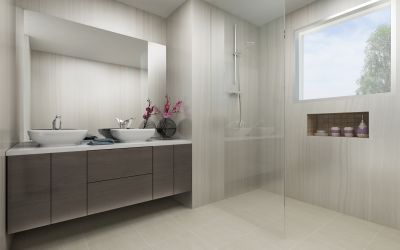 * Floor to ceiling porcelain tiles in bathrooms